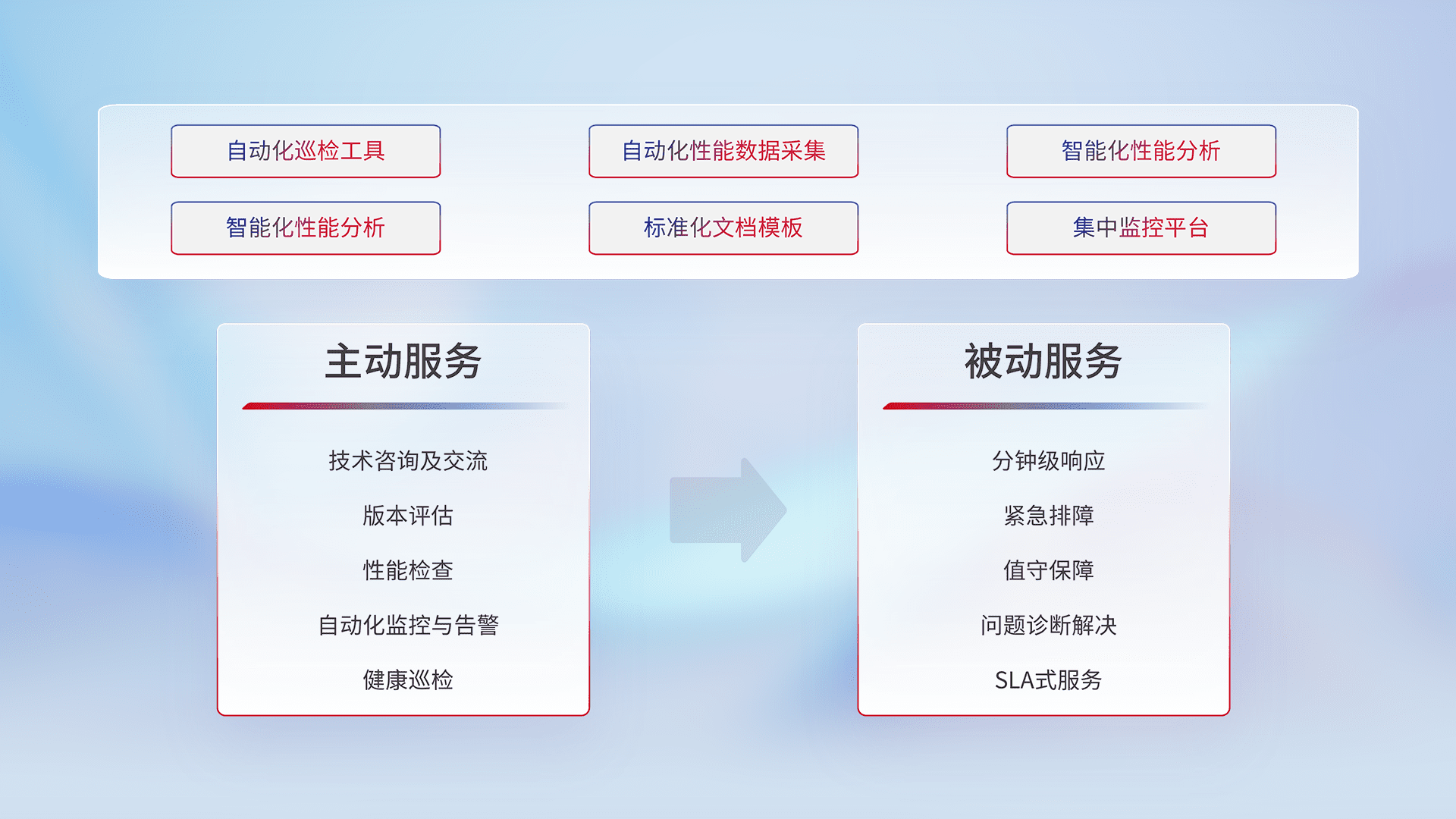 智能化工具和标准化文档,,保障服务质量,,提供主动服务(包含技术咨询、、、版本评估、、、、性能检查、、、、自动化监控与告警、、健康巡检)和被动服务包含(分钟级响应、、紧急排障、、、值守保障、、、问题诊断解决、、、SLA服务)。。
