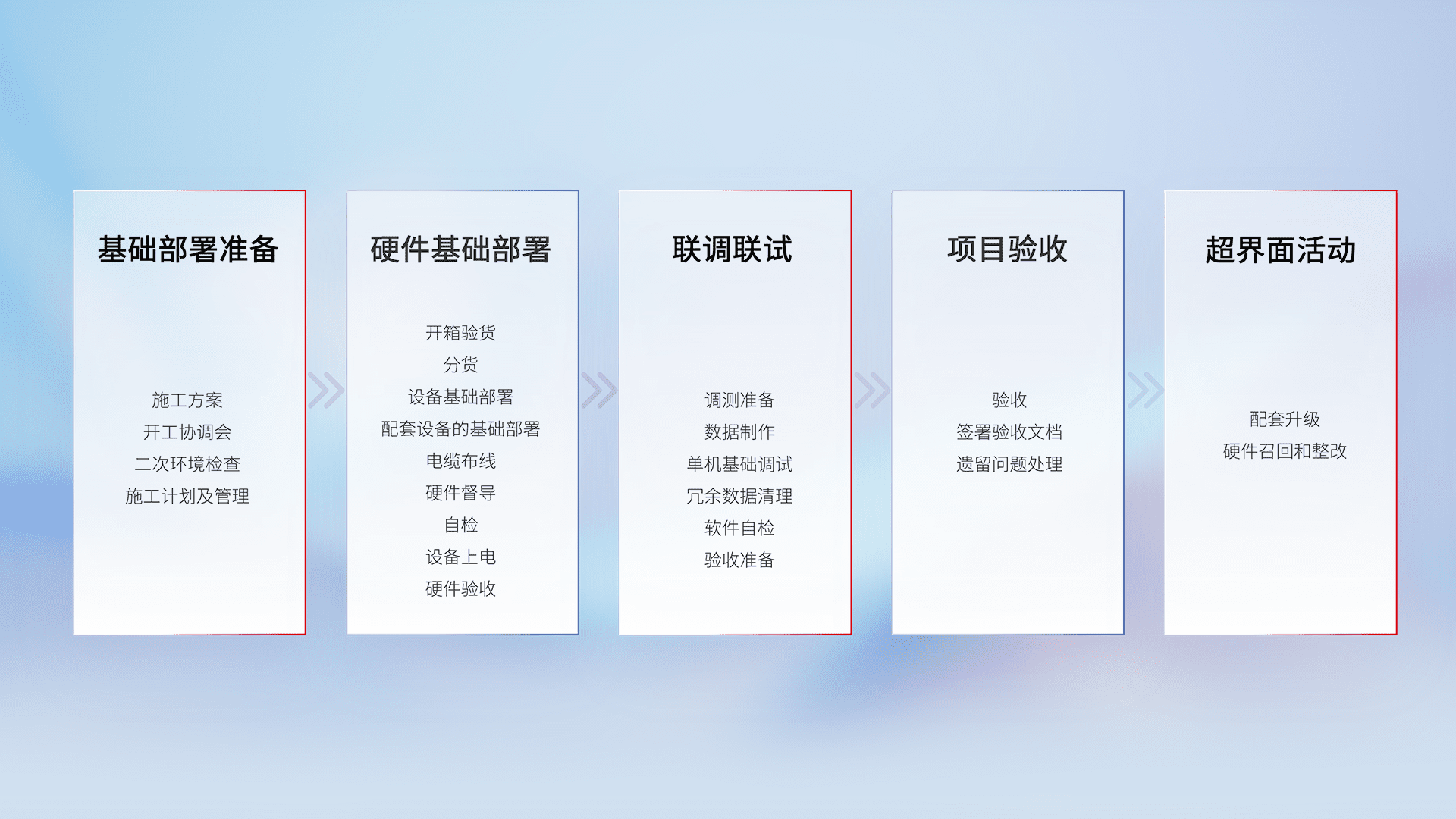从基础部署准备、、、硬件基础部署、、、、联调联试、、、项目验收、、越界面活动的全过程可追溯,,,保证施工质量和进度。。