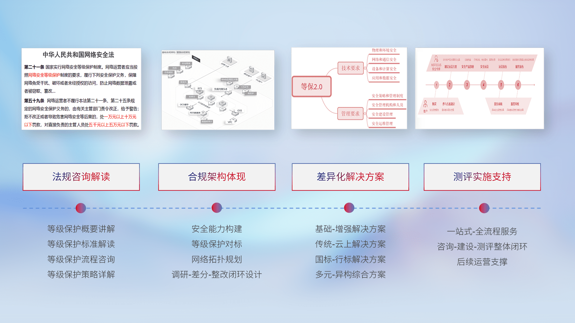 通过专业的法律咨询解读、、、、合规架构体现、、、、差异化解决方案、、测试实施支持等服务,,为客户量身打造等保合规体系。。